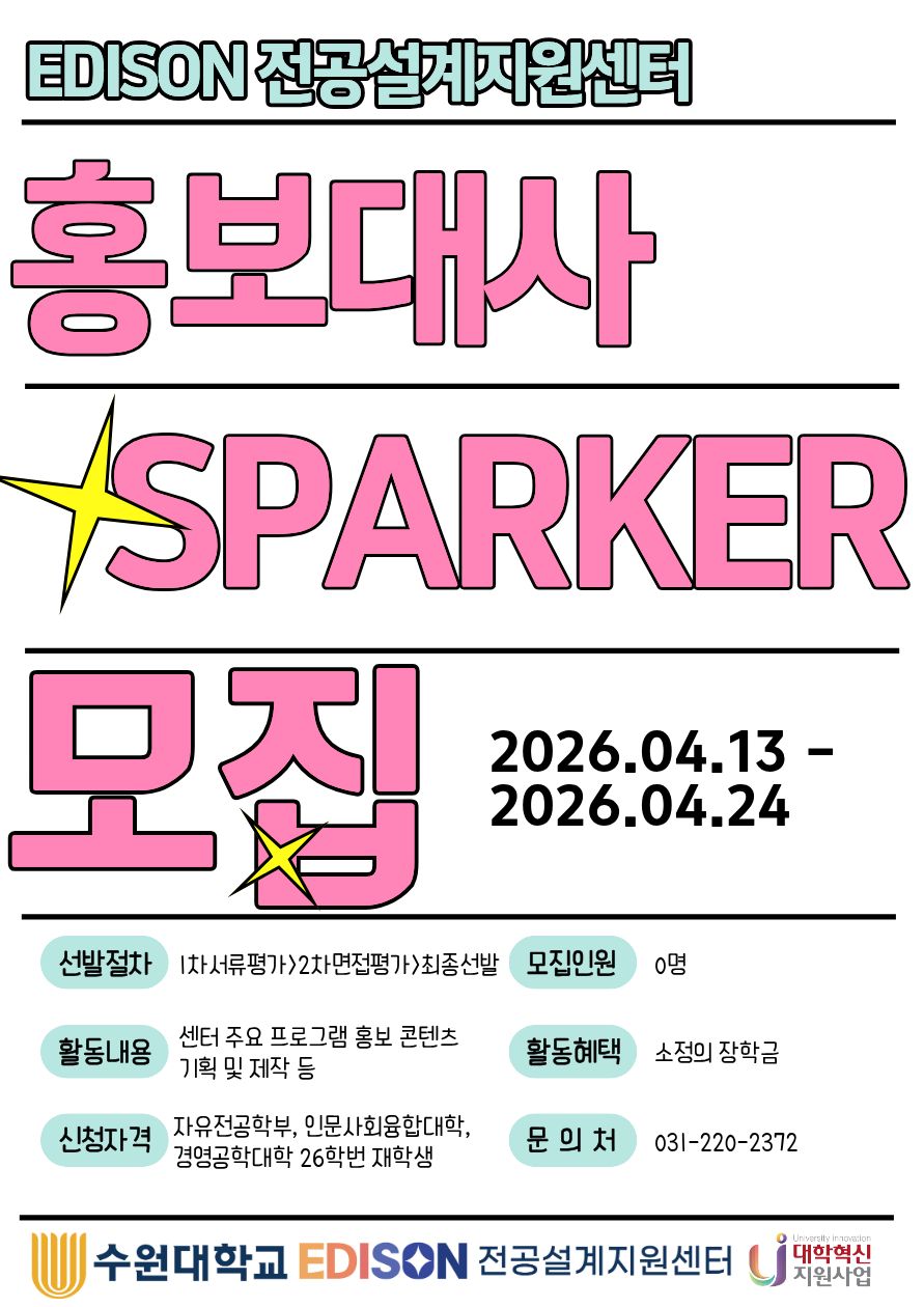 EDISON전공설계지원센터에서 자유전공학부(인사융/경영 포함) 26학번 재학생들의 성공적인 전공 탐색과 설계를 돕고, 센터의 다양한 프로그램을 함께 알릴 “EDISON스파커(Spaker)” 홍보대사를 모집합니다.